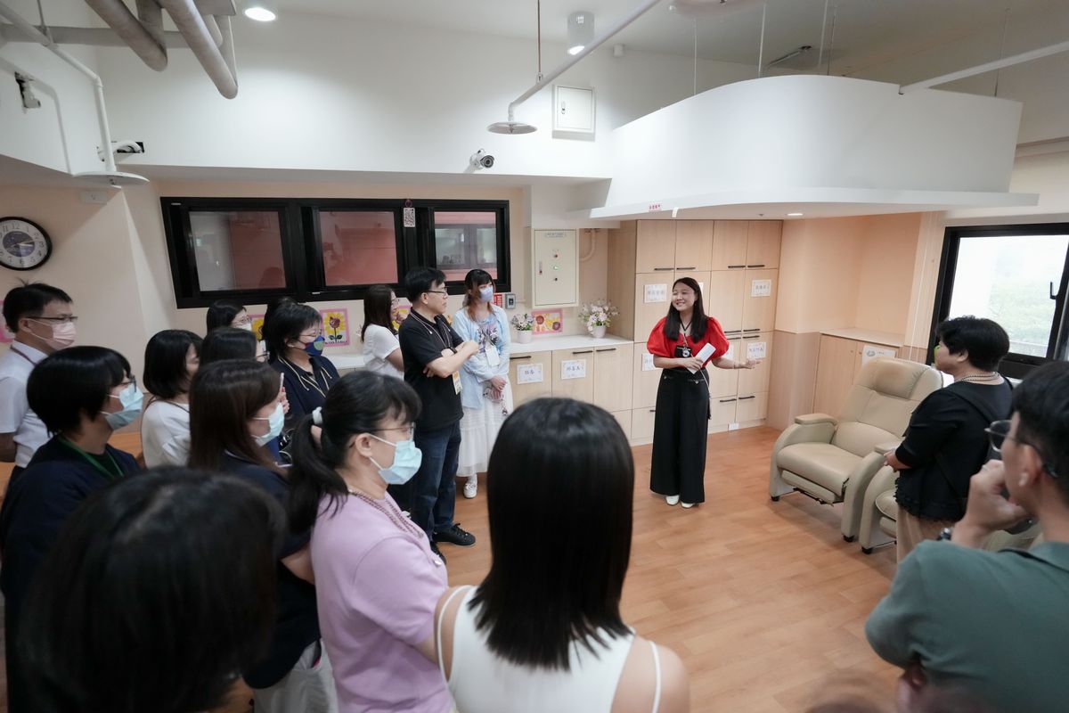▲奇岩長青樂活大樓陳瓊珊主任引導與會者參觀日照中心。