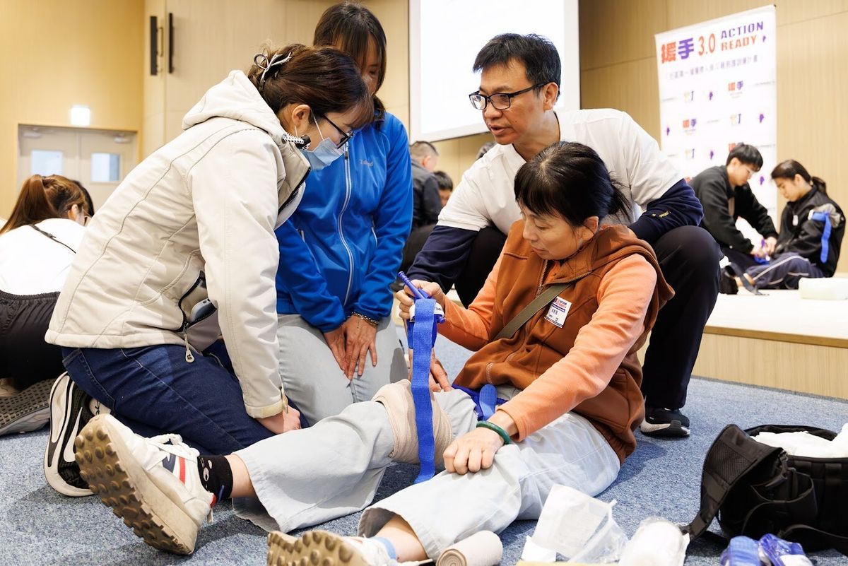 ▲ 基礎止血課程中指導員帶領學員操作止血帶自救。