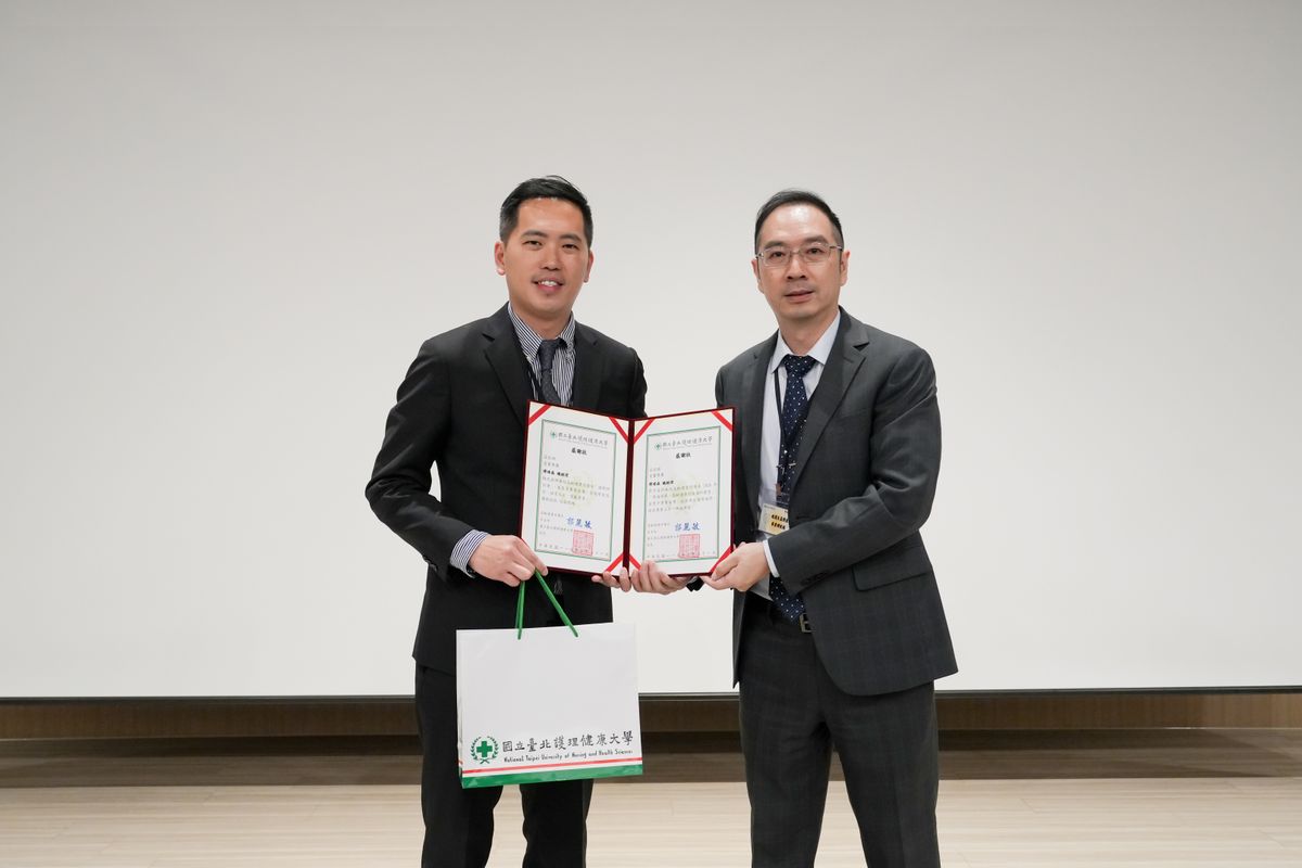 ▲ 北護大蔡君明教務長代表頒贈傅總經理感謝狀。